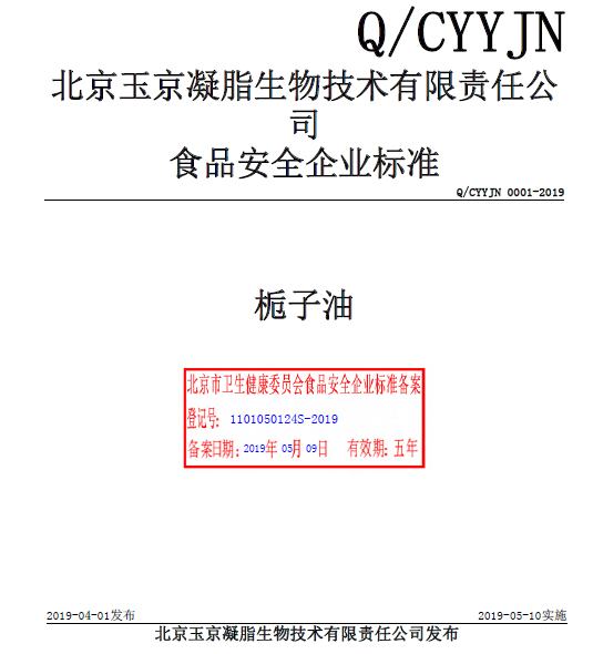 北京玉京凝脂生物技术有限责任公司本次备案的企业标准《栀子油》,经过我公司技术人员朱丽真老师的编写、备案,所提交的材料符合北京市卫健委的备案要求,于2019年05月成功备案并在北京市食品安全标准管理系统公示。