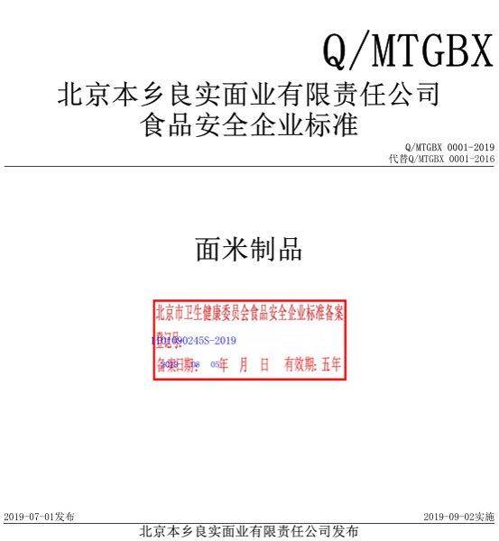 北京本乡良实面业有限责任公司本次备案的企业标准《面米制品》,经过我公司技术人员朱丽真老师的编写、备案,所提交的材料符合北京市卫健委的备案要求,于2019年08月成功备案并在北京市食品安全标准管理系统公示。