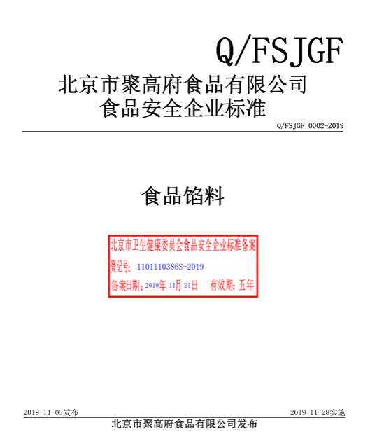 北京市聚高府食品有限公司本次备案的企业标准《食品馅料》,经过我公司技术人员张炳福老师的编写、备案,所提交的材料符合北京市卫健委的备案要求,于2019年11月成功备案并在北京市食品安全标准管理系统公示。