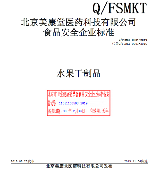 北京美康堂医药科技有限公司本次备案的企业标准《水果干制品》,经过我公司技术人员朱丽真老师的编写、备案,所提交的材料符合北京市卫健委的备案要求,于2019年11月成功备案并在北京市食品安全标准管理系统公示。