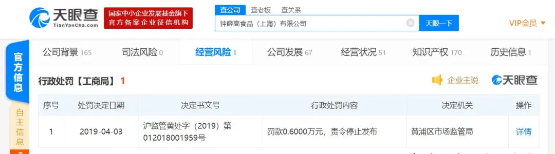 天眼查风险数据显示,2019年4月,因发布虚假广告,宣传语描述的多款食品成分与实际不符等,钟薛高被黄浦区市场监管局罚款6,000元,并责令停止发布。