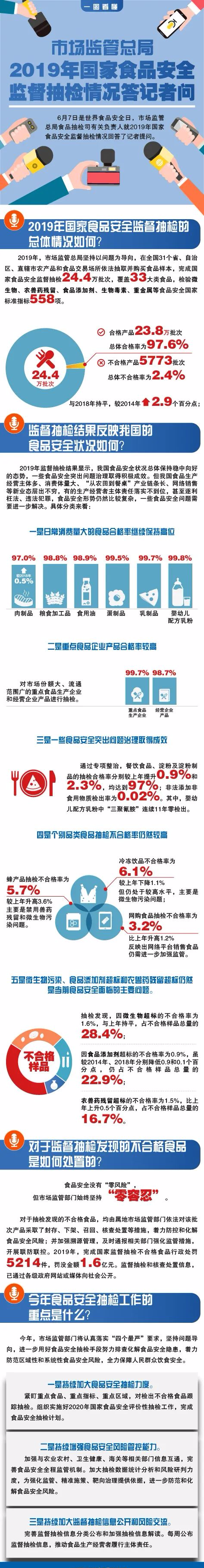 国家市场监管总局食品安全总监王铁汉在活动期间公布2019年国家食品安全监督抽检情况。据介绍,2019年市场监管总局完成国家食品安全监督抽检24.4万批次,覆盖33大类食品,检验食品安全国家标准指标558项。抽检的总体合格率为97.6%,与2018年持平。