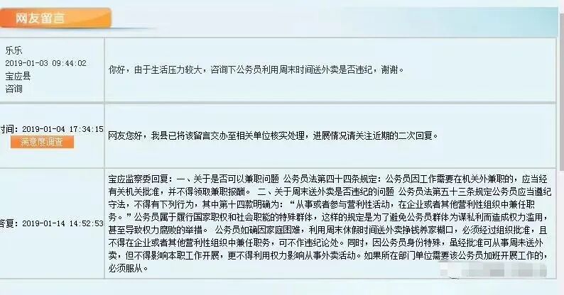 2019年1月,一名自称属于扬州市宝应县的网友“乐乐”在扬州市人民政府网站“寄语市长”频道留言:你好,由于生活压力较大,咨询下公务员利用周末时间送外卖是否违纪?