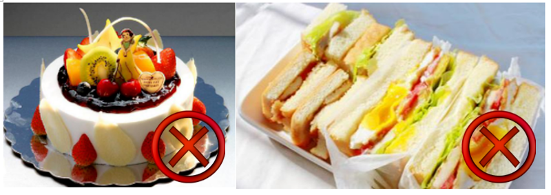 ② 采用校外集体用餐配送单位的:不得配送冷食类食品(如沙拉、寿司等)、生食类食品(如刺身)、自制冷冻饮品(包括冰淇淋、酸奶、乳酸发酵饮料、鲜榨果汁以及其他冷冻饮品)、裱花蛋糕以及其他冷加工糕点。