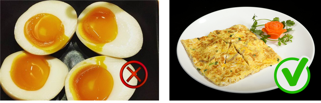 ② 鸡蛋:使用鸡蛋前,应清洗干净蛋的外壳,必要时消毒外壳。烹饪时必须确保烧熟煮透。不得提供以生鸡蛋为原料且不经彻底加热处理的三文治、沙拉等食品。