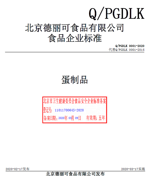 北京德丽可食品有限公司本次备案的企业标准《蛋制品》,经过我公司技术人员朱丽真老师的编写、备案,所提交的材料符合北京市卫健委的备案要求,于2020年3月成功备案并在北京市食品安全标准管理系统公示。