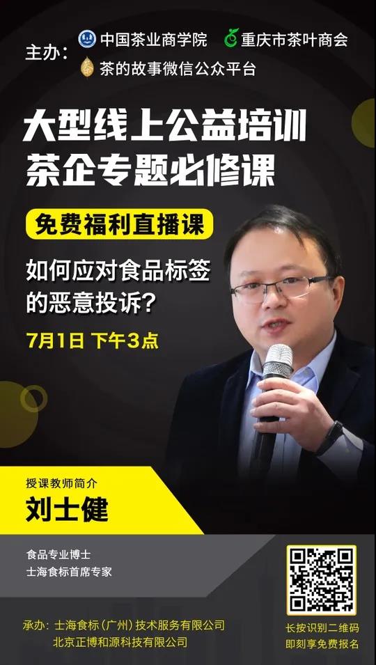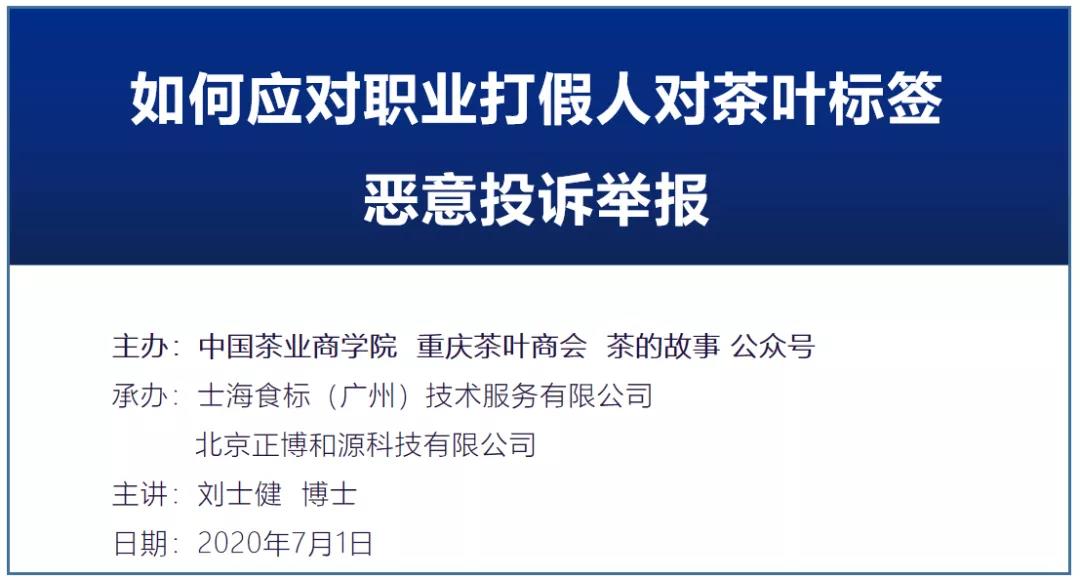 为帮助茶叶生产、流通企业解决屡遭职业打假人对食品标签恶意投诉及举报的困境,由中国茶业商学院、重庆市茶叶商会、茶的故事微信公众平台联合主办,士海食标及正博和源承办的《茶企如何应对食品标签恶意投诉举报》大型线上公益培训于2020年7月1日成功举行,我公司刘士健博士、池建敏和汤婷老师承担了这次培训授课任务。