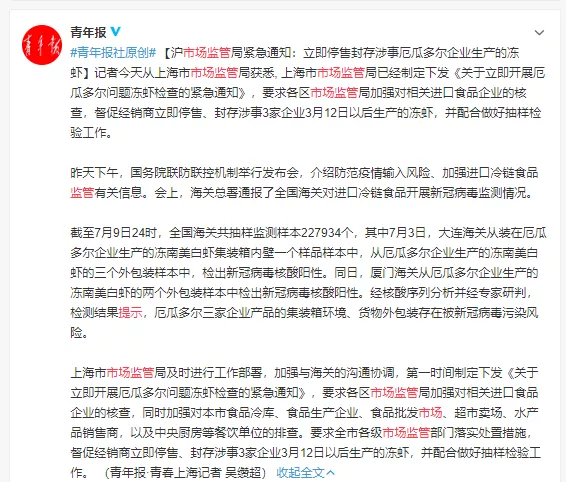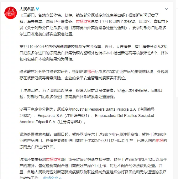 向广大新区群众和消费者发出温馨提示:要时刻加强对食品安全问题和新冠疫情的自我防护意识,切不可有任何的麻痹放松思想,购买冻虾产品时要仔细查看生产厂家和产品批次等信息,务必不要购买和食用涉及3家厄瓜多尔冻虾出口企业的相关批次产品,如发现有关商家存在可疑冻虾产品的使用、销售行为,要及时向市场监管部门进行举报,监督举报电话:12315。