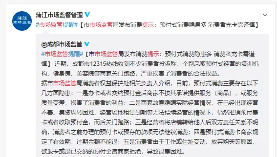 浦江市市场监管局再次提醒广大消费者,预付式消费有风险,办卡充值需谨慎理性,认真阅读合同,及时保存证据方便日后维权。