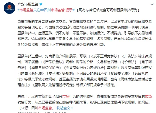 【直播带货亟待规范】直播带货过程中,对商品的介绍和展示,可以由《反不正当竞争法》《广告法》等法律规制;商品质量由《产品质量法》规制;商品的价格、交易和售后等由《价格法》《电子商务法》《消费者权益保护法》《零售商促销行为管理办法》等规制;涉及商标等知识产权问题由《商标法》《专利法》等规制;不同品类的商品还受《食品安全法》《药品管理法》等相关领域法律规制;甚至主播的表演和用语文明问题,也有《网络表演经营活动管理办法》《互联网文化管理暂行规定》等相关部门规章予以规范。