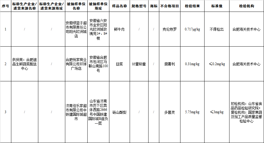 (一)安徽绿篮子超市有限责任公司阳光欧洲城店销售的鲜牛肉,克伦特罗不符合食品安全国家标准规定。检验机构为合肥海关技术中心。