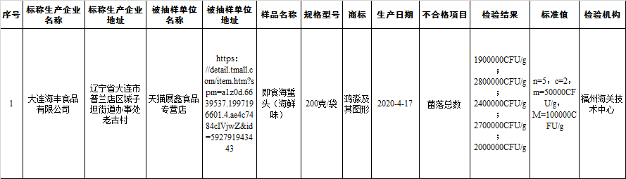天猫展鑫食品专营店(经营者为辽宁省大连展鑫商贸有限公司)在天猫(网店)销售的、标称辽宁省大连海丰食品有限公司生产的即食海蜇头(海鲜味),菌落总数不符合食品安全国家标准规定。检验机构为福州海关技术中心。