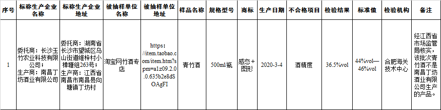 淘宝网竹酒专店(经营者为湖南省长沙市望城区朱亮酒水商行)在淘宝网(网店)销售的、标称湖南省长沙玉竹农业科技有限公司委托江西省南昌丁坊酒业有限公司生产的青竹酒,经合肥海关技术中心检验发现,其中酒精度不符合产品标签标示要求。南昌丁坊酒业有限公司对产品真实性提出异议。经江西省市场监管局核实,该批次青竹酒是假冒南昌丁坊酒业有限公司生产的产品。